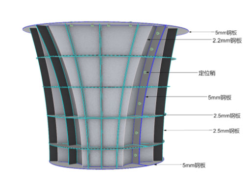 2.龙骨:3mm厚钢板台阶肋、2.5mm钢带箍。